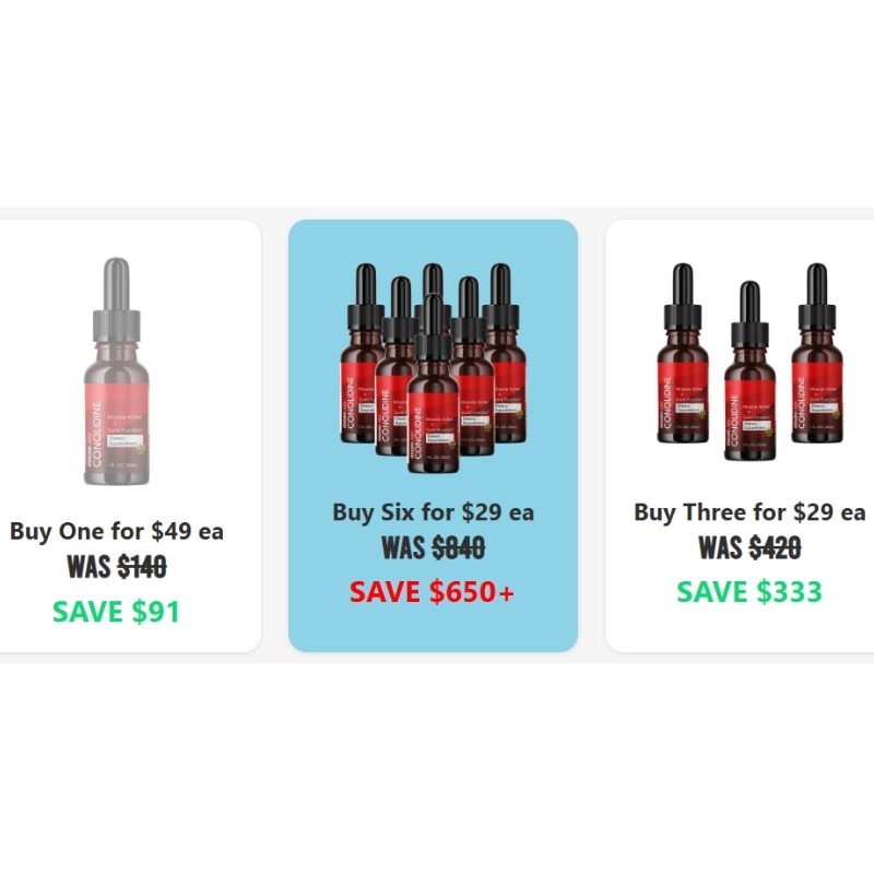 - 6 Bottles of Conolidine: The best value option, priced at $720, now available for $174. This package saves you $650, includes FREE shipping, and a $50 gift card. Each bottle in this package is just $29.